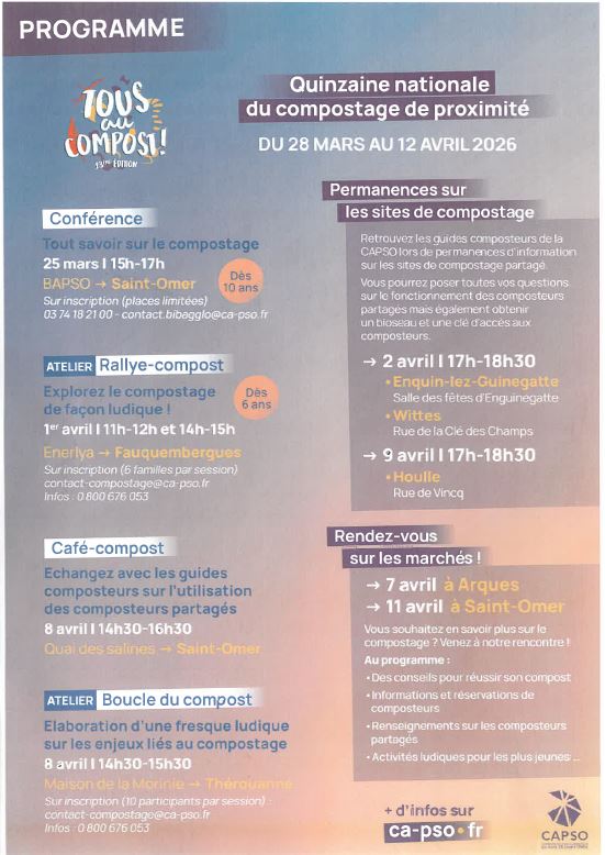 - March 25 from 3pm to 5pm at the BAPSO: Conference "Everything you need to know about composting (for children aged 10 and over).