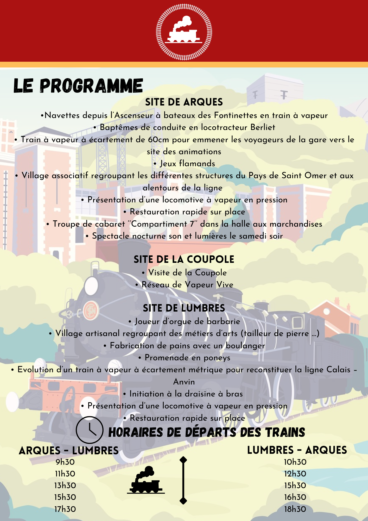 Bookings must be made at the time indicated. Your ticket includes access to the events at Arques station.
